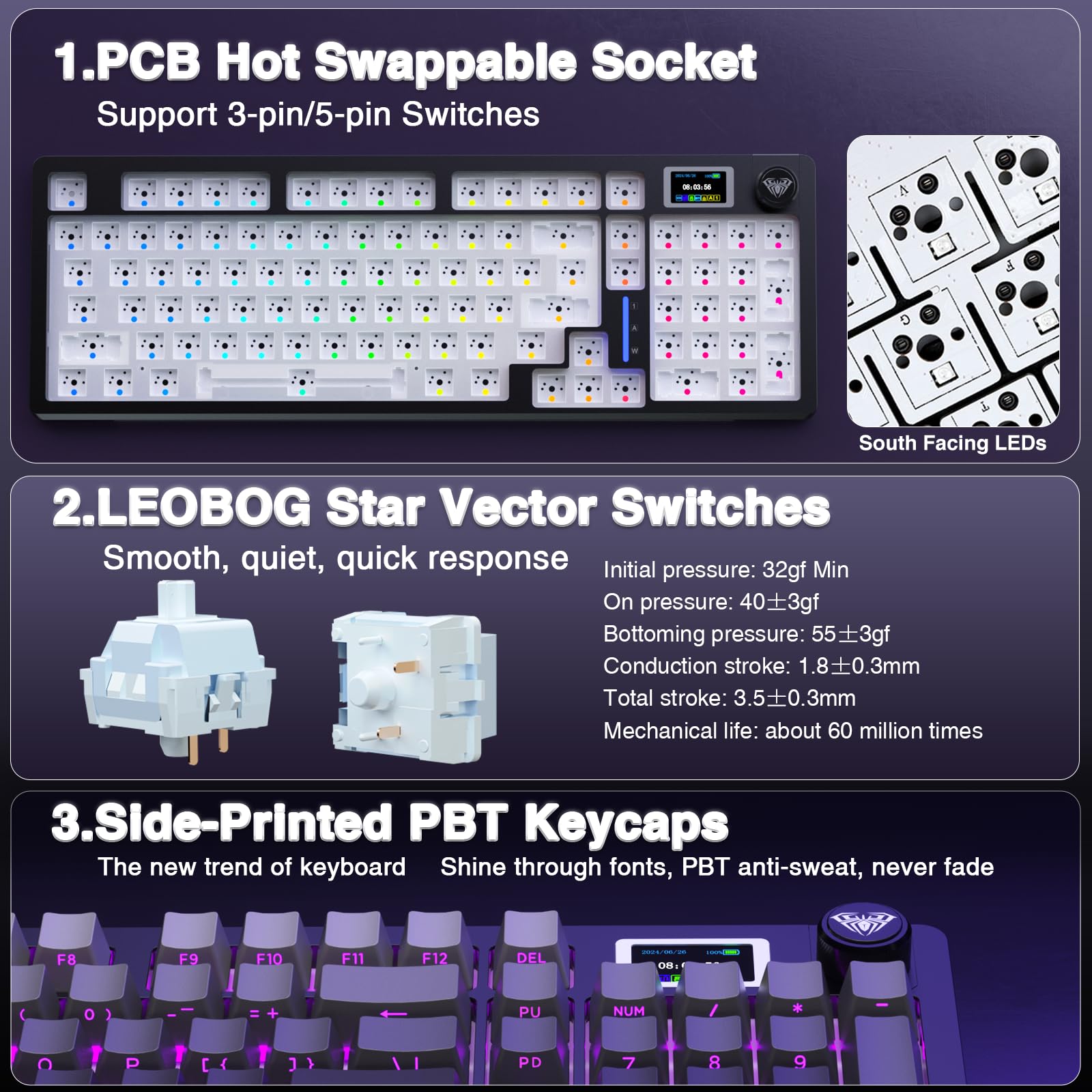 - Hot-swappable Custom Keyboard: The S98 Pro mechanical keyboard wireless comes with a hot-swappable base that is compatible with 3-pin or 5-pin switches. Without the soldering process, users can easily replace switches and keycaps to customize their keying experience (keycap/switch puller is included in the package). Equipped with pre-lubricated stabilizers and switches, the creamy keyboard bring smooth typing feeling and pleasant creamy mechanical sound, providing fast response for exciting games(NOTE: Turn off the power to the keyboard when replacing the switch.)