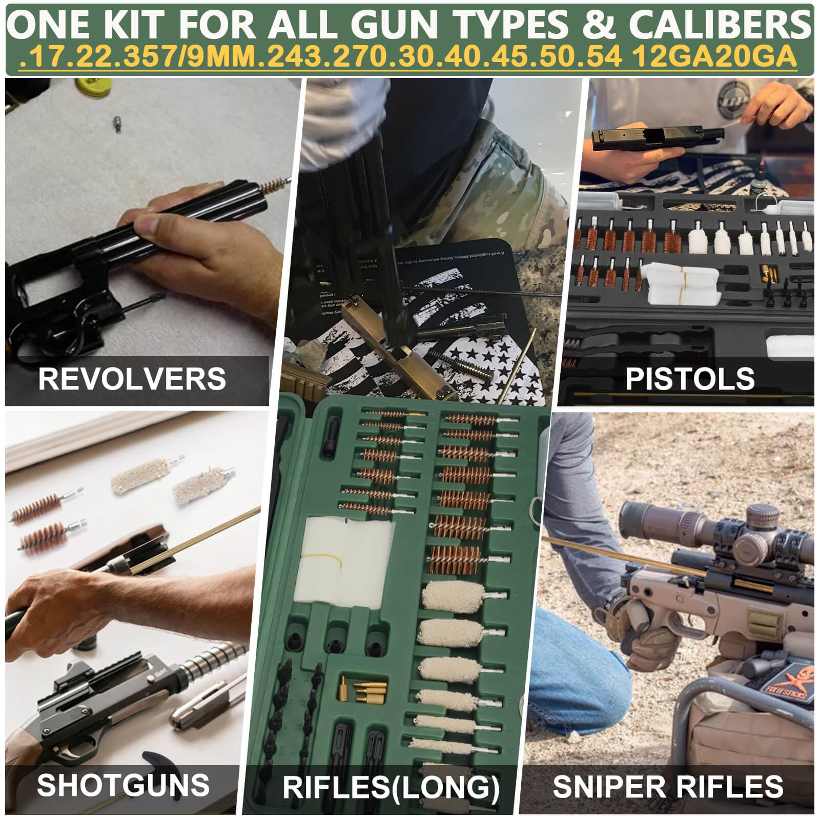 - →Universal gun cleaning kit provides all the tools needed to properly clean any type of rifle, shotgun, or handgun. This gun cleaning supplies kit has everything you will need to do a great job cleaning. Full-featured user guide for beginners is also included. The firearm cleaning kit is the premium choice for both new beginners, hunters, gun enthusiasts, and professional shooters!