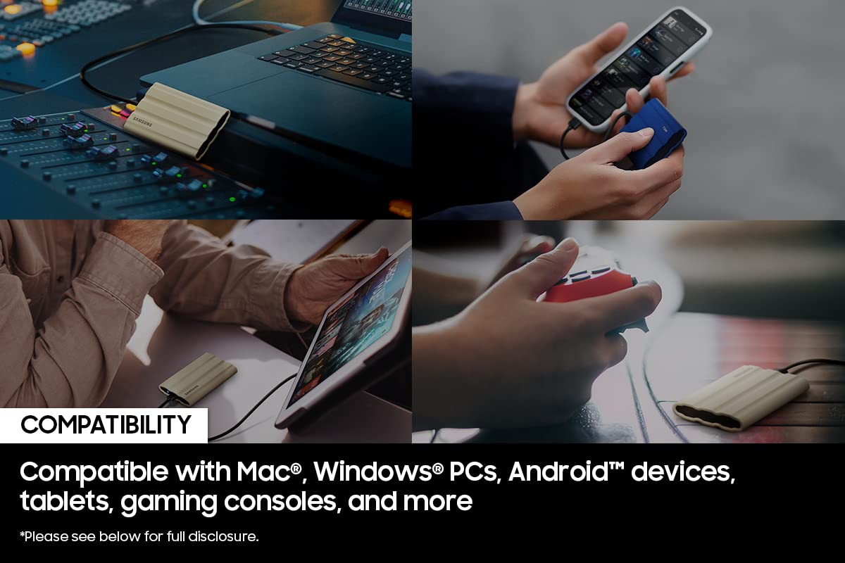 Details: Samsung T7 Shield Portable SSD delivers high performance on-the-go, not matter the terrain. It has an IP65 rating for water1 and dust2 resistance, with Dynamic Thermal Guard to manage heat control. Transfer huge files instantly. USB 3.2 Gen 2 and PCIe® NVMe achieve soaring sequential read/write speeds of up to 1,050/1,000 MB/s4, allowing you to edit directly from the drive. The rugged design and advanced outer elastomer add extra durability to even endure a 9.8 foot drop3. The T7 Shield is compatible with PC, Mac, Android devices, gaming consoles, and more. 1Consistent with IP65 rating, tested under controlled conditions: water flow of 100kPa for 3 minutes. Water resistant capabilities may vary depending on the actual conditions. 2Consistent with IP65 rating, tested under controlled conditions: 2kg/m³ of active dust with a pressure under 2kPa for 8 hours. Dust resistant capabilities may vary depending on the actual conditions. 3Tested to withstand 9.8-ft (3 meters) drop under controlled conditions. Drop resistance capability may vary depending on the actual environmental conditions. 4Performance may vary depending on host configuration. To reach maximum read/write speeds of up to 1,050/1,000 MB/s, respectively, the host device and connection cables must support USB 3.2 Gen 2 and the UASP mode must be enabled. 5Tested to withstand 9.8-ft (3 meters) drop under controlled conditions. Drop resistance capability may vary depending on the actual environmental conditions. 6Source: 2003-2022 OMDIA data: NAND suppliers' revenue market share. 7Included SSD cable recommended.