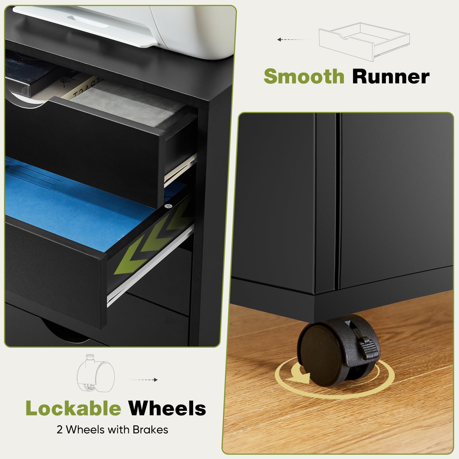 Sweetcrispy 5 Drawer Chest Mobile Storage Cabinets Small Wooden Dresser with Wheels Room Organization Furniture for Office Home, Dark Black Wood
